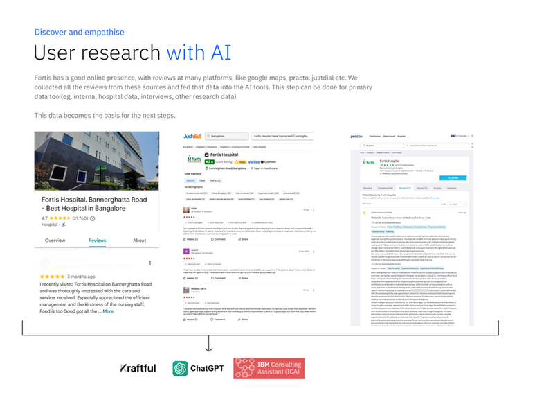 After going through the design process, we also attempted to build a design assistant for Fortis. So that someone from their staff/decisionmaker/representative could enter a few prompts, the assistant could run the whole design thinking process for them and provide them with insights and solutions. We used ICA for building this. Right now it is limited to text-based outputs, but connecting it to other AI applications (eg, Galileo for UI, Invideo for videos, etc) is the step forward for it to realise its full potential.